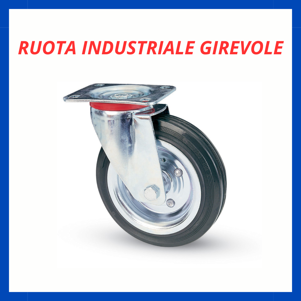 Supporto a piastra girevole in acciaio stampato rotante su doppia corona di sfere. Rivestimento in gomma piena, flange in acciaio cromato stampato zincocromato, mozzo su gabbia a rulli.
